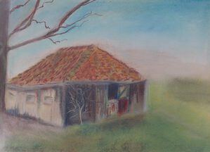 2022pasteltekening van een oud schuurtje naar de waarneming