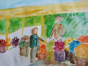 2025vrolijke kraam met bloemen en mensfiguren, oefening perspectief, aquarel
