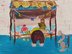 2025marktkraam, perspectief, vrolijk, sokken passen, acrylverf